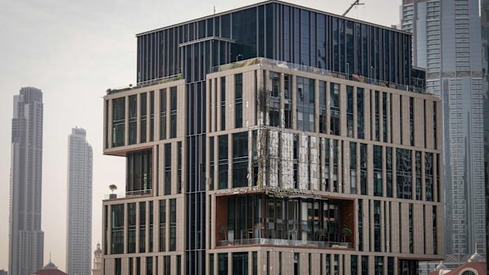 The higher floors of DIFC’s Innovation One tower, where the Sexy Fish restaurant is located on the ground floor, bore visible damage, including smashed-out windows and pockmarked cladding. The restaurant itself was not damaged and will reopen on Saturday, a spokesperson said.