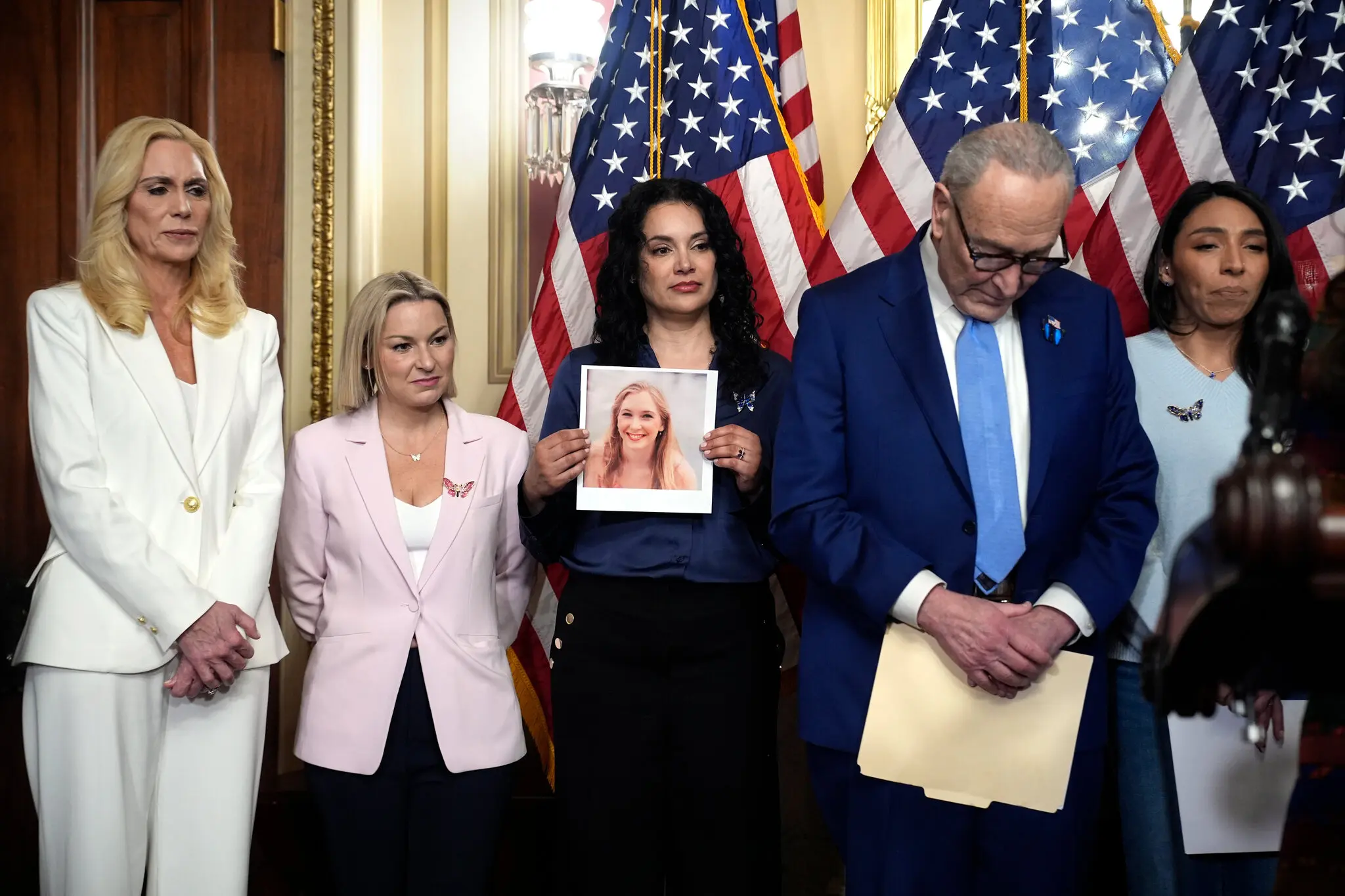 Survivors of Jeffrey Epstein’s abuse during a news conference by Senator Chuck Schumer of New York, the Democratic minority leader, earlier this month.