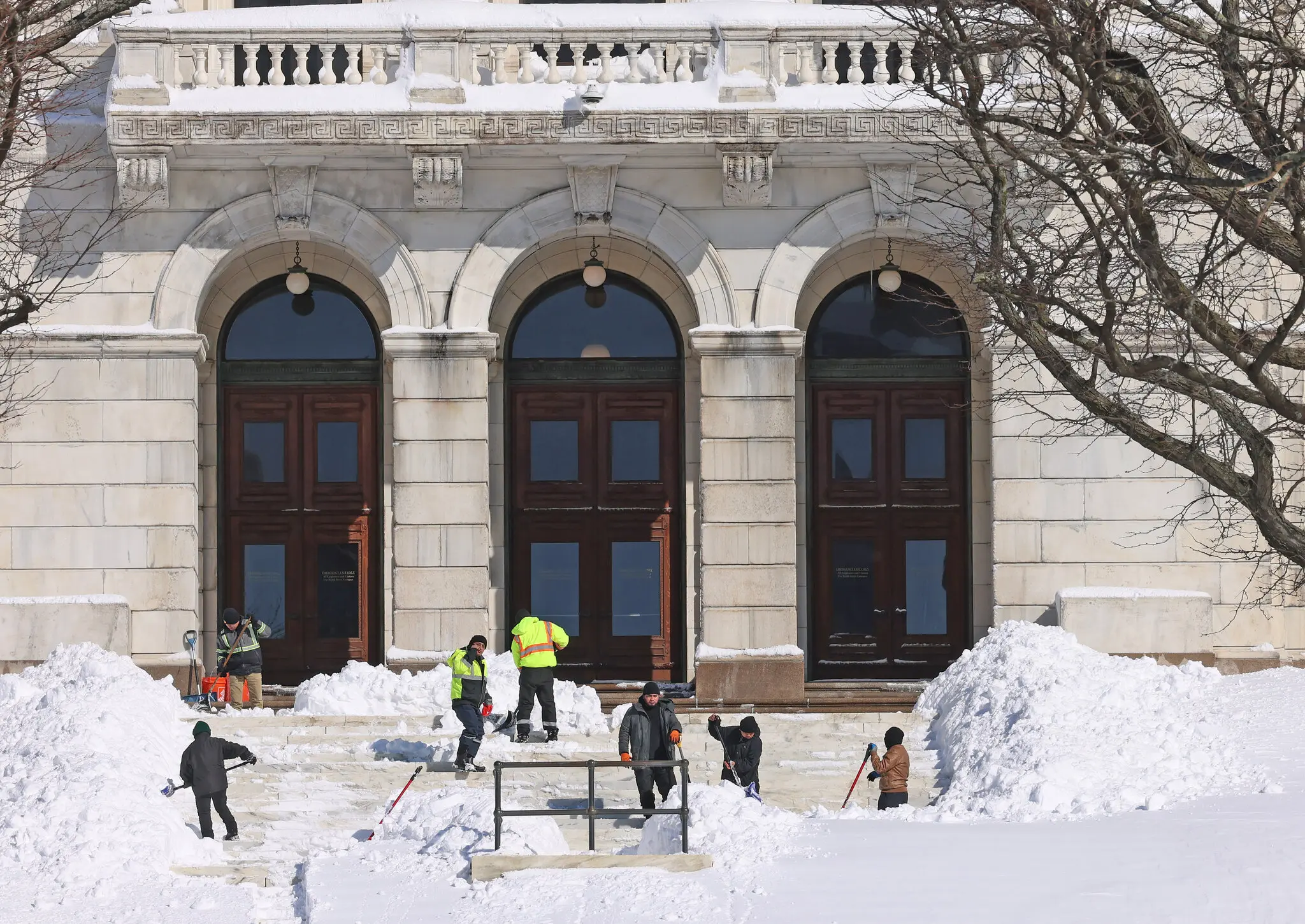 Work crews shovel snow from the steps of the Rhode Island State Capitol on Tuesday in Providence, R.I.