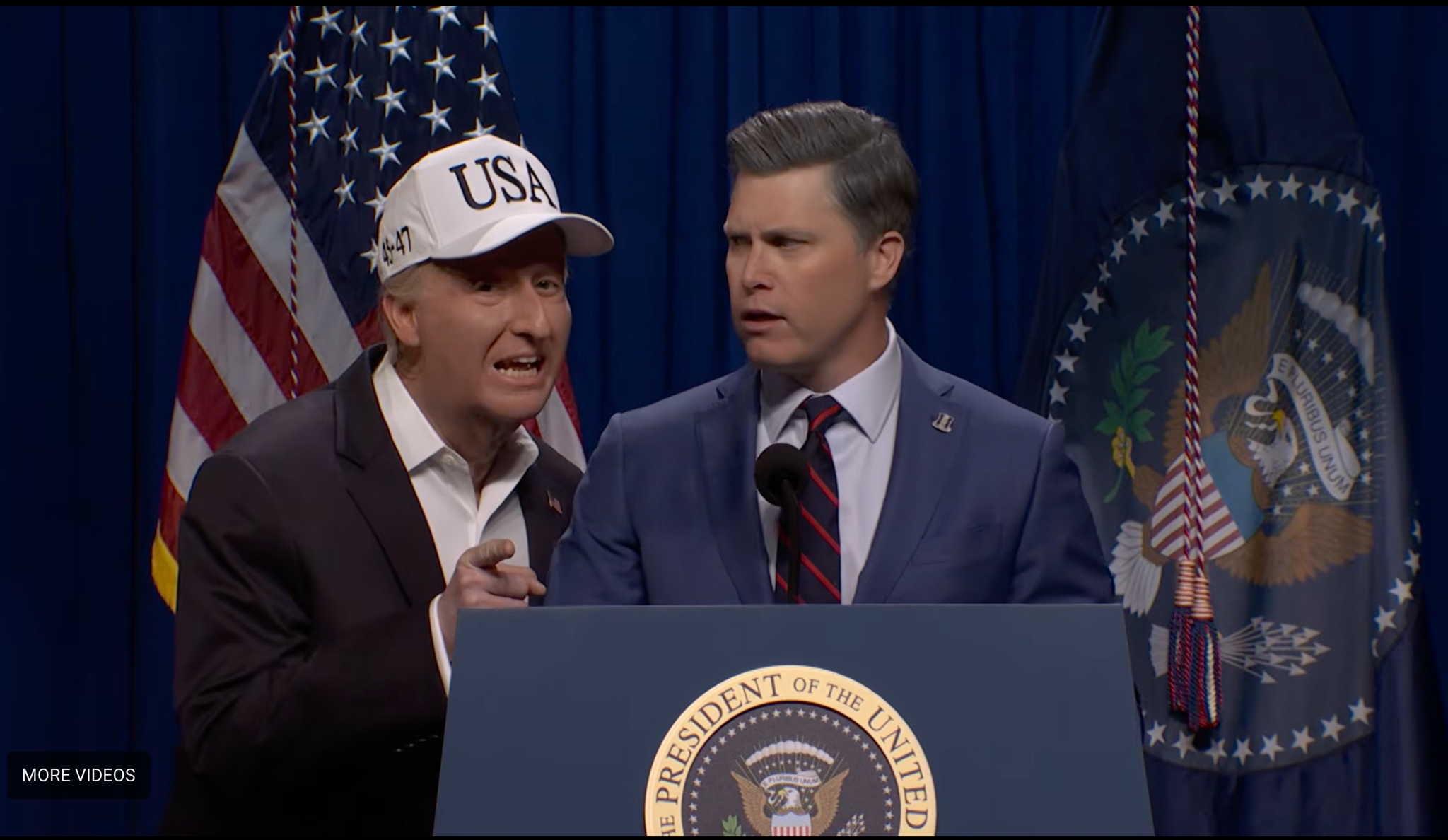 James Austin Johnson, in his recurring role as President Trump, approached a lectern wearing a similar white USA cap and declared, “Happy World War III to all who celebrate.”