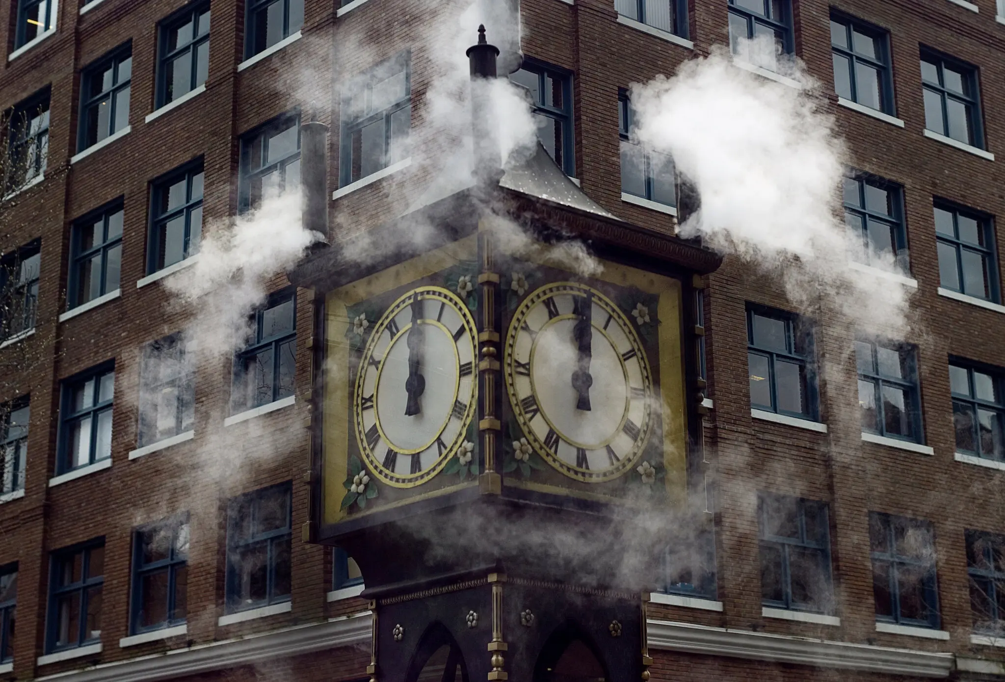 The Gastown Steam Clock marking the noon hour in Vancouver, British Columbia.