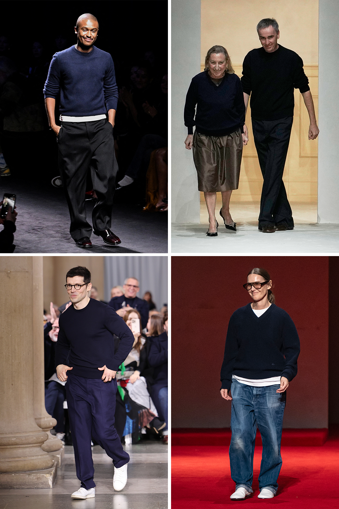 Clockwise from top left: The designer bow uniform, as modeled by Maximilian Davis at Ferragamo; Raf Simons at Prada; Louise Trotter at Bottega Veneta; and Erdem Moralioglu.
