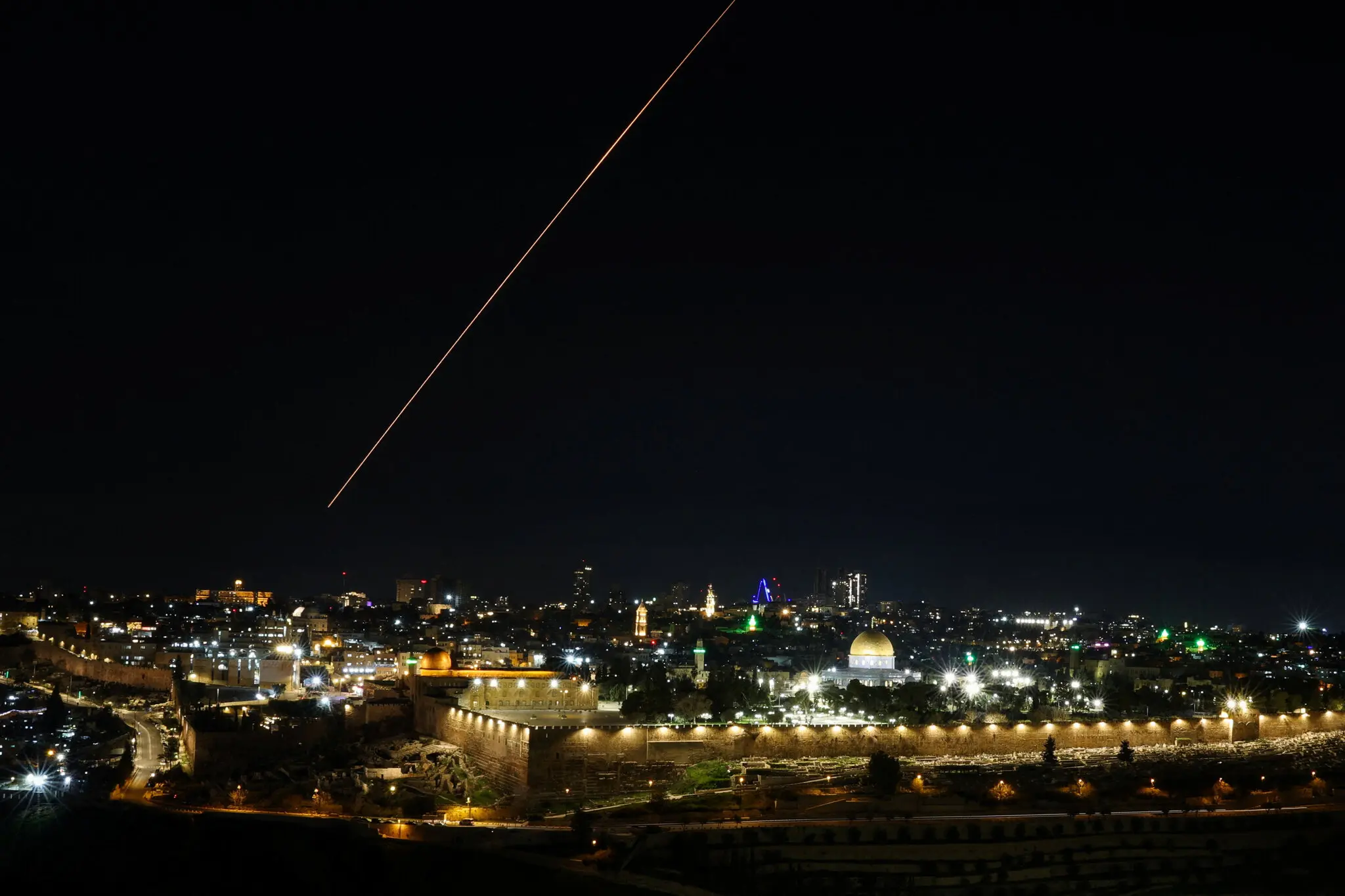 An missile fired to intercept incoming fire flying over Jerusalem on Sunday, with the Al-Aqsa Mosque compound visible in the foreground.