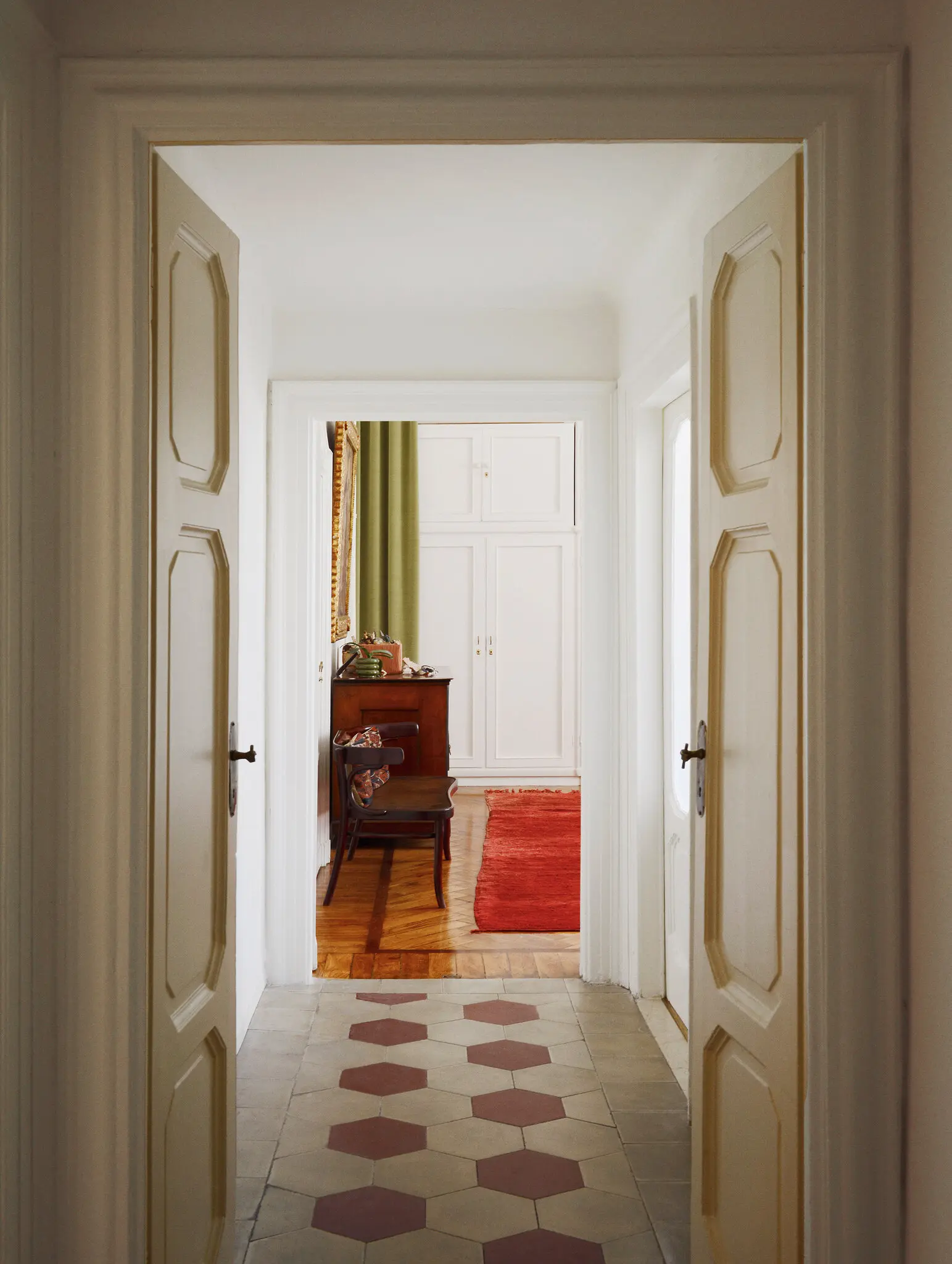 At the entrance to the primary bedroom of Mario Milana and Gabriella Campagna’s Milan apartment, an early 20th-century Thonet bench sits alongside a Berber Rehamna rug.
