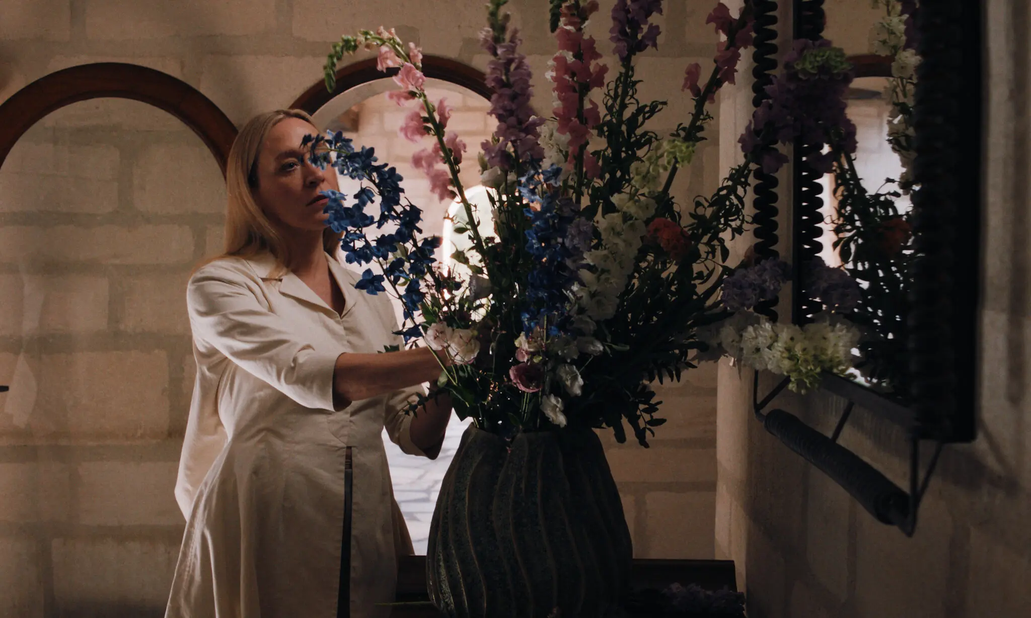 The actress Chloë Sevigny arranging flowers in a scene from the 2024 film “Bonjour Tristesse.”