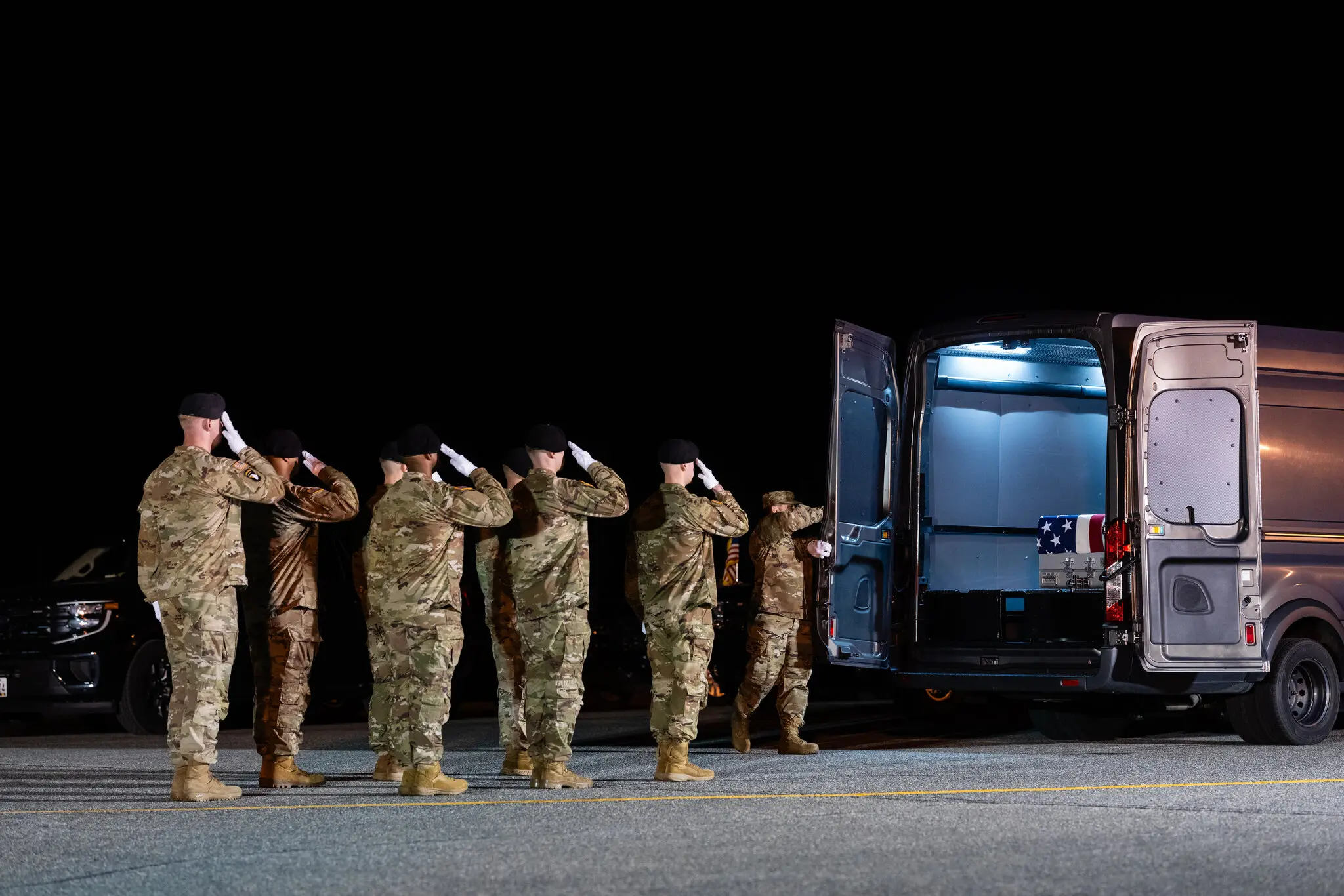 A vehicle containing the remains of Sgt. Benjamin N. Pennington at Dover Air Force Base in Delaware. He was the seventh American service member killed in the Iran war.
