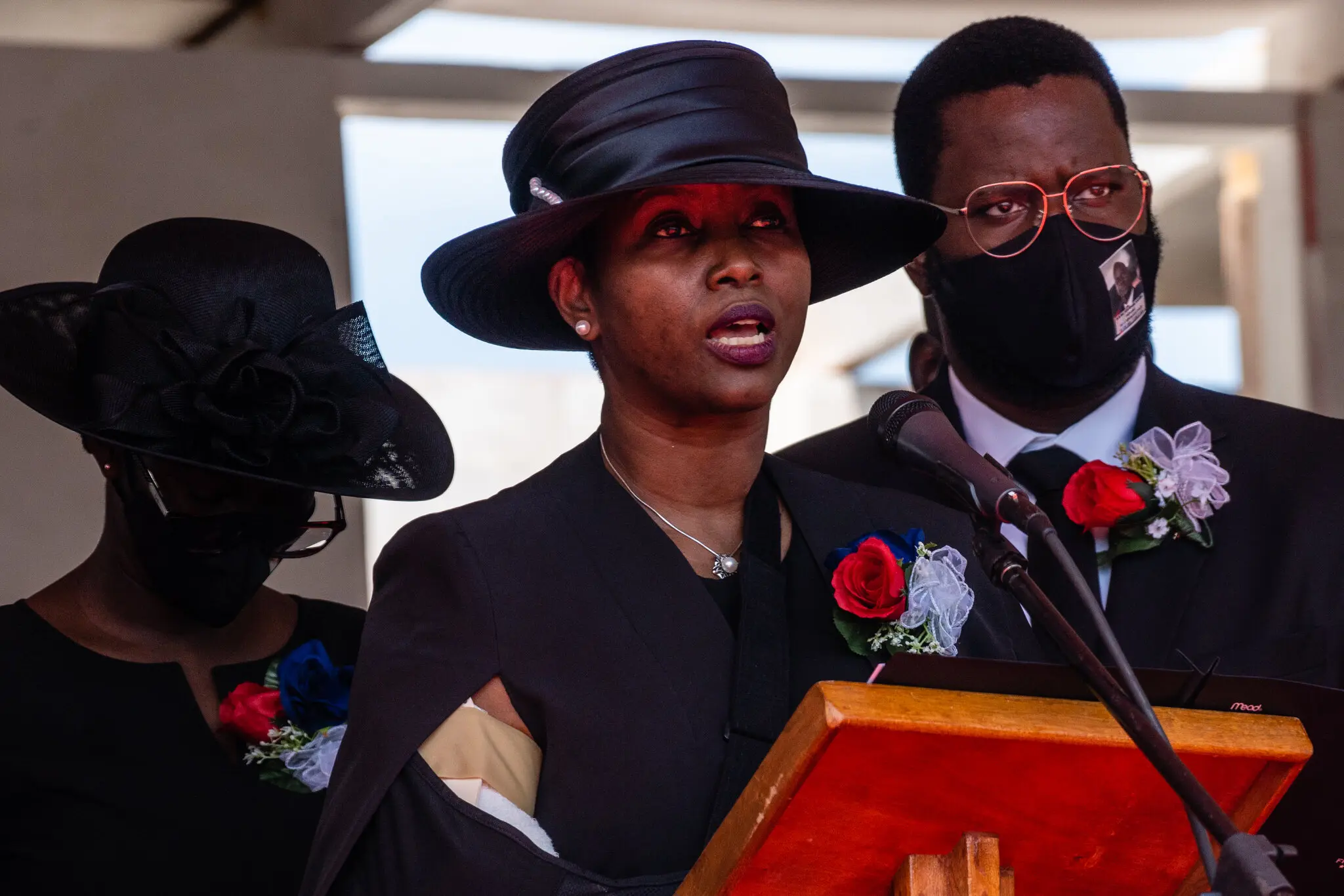 Martine Moise, speaking during the funeral of her husband, Jovenel Moise, in Cap Haitien, Haiti, in 2021.