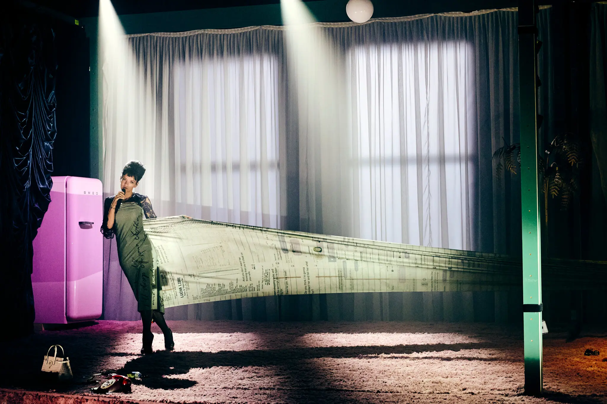 While performing the song “4chan Stan,” which details a woman’s discovery of her husband’s infidelity via receipts she finds in a bedside drawer, Ms. Allen pulls a long stretch of green fabric around her body. The cloth is printed with receipts from places like the Plaza Hotel in New York, Nobu and Chanel, along with fragments of text messages and handwritten notes.