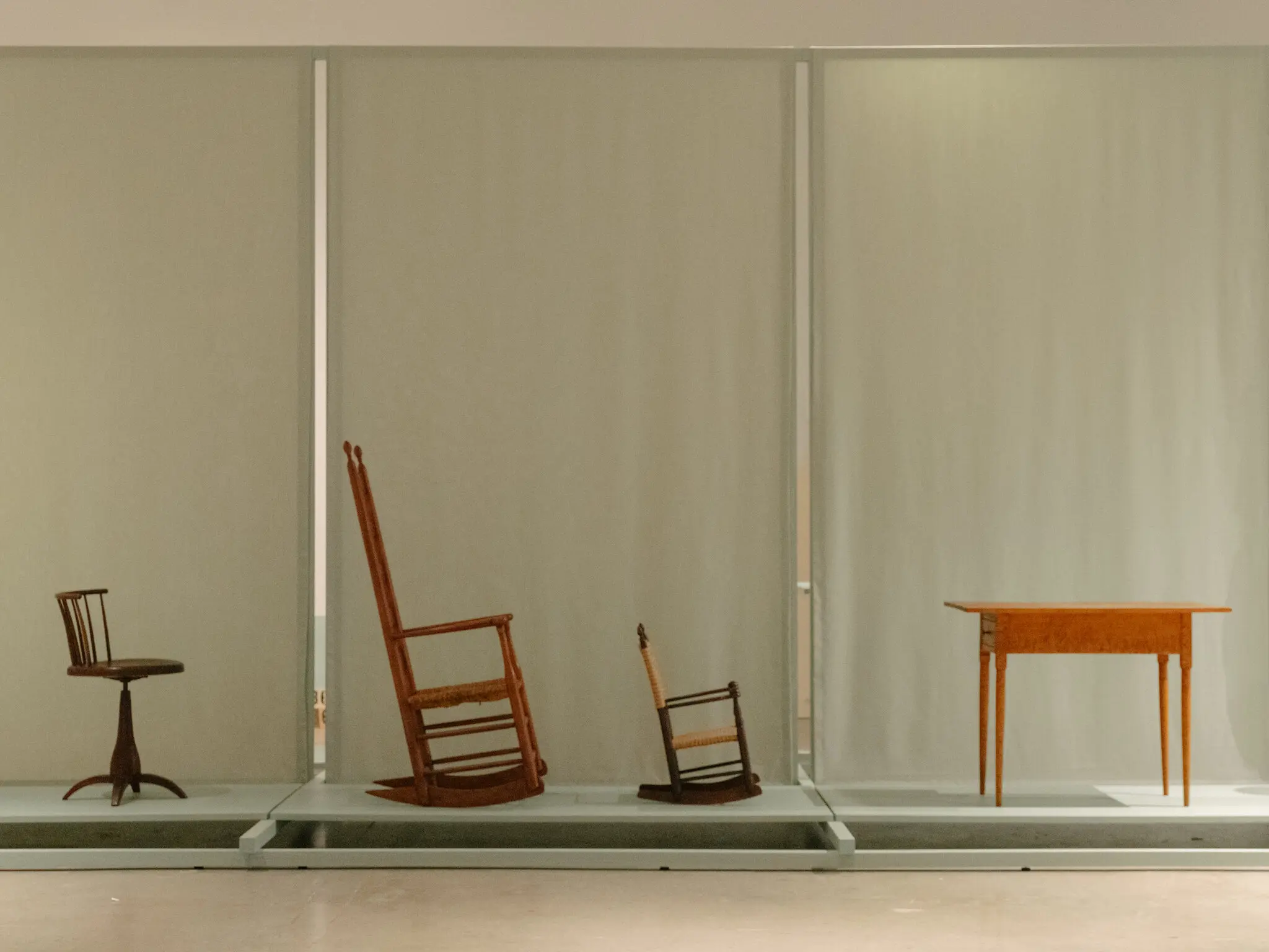 From left: a swivel chair from the Shaker community in Mount Lebanon, N.Y., circa 1860; an elder’s rocking chair, circa 1850-1870; a child’s armed rocking chair with tape seat, circa 1880; a side table, circa 1840.