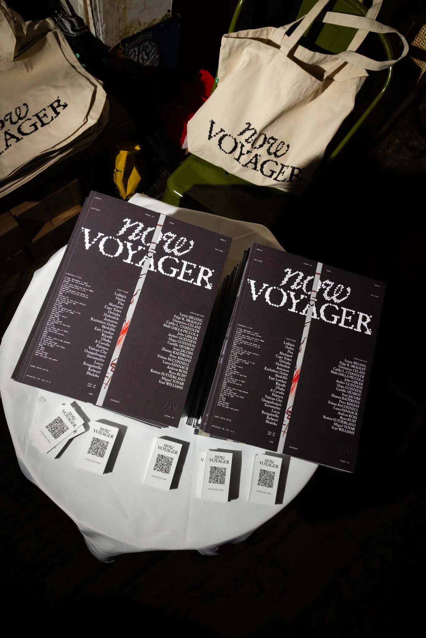 The $29 debut issue, filled with international dispatches, and the totes to go with it.