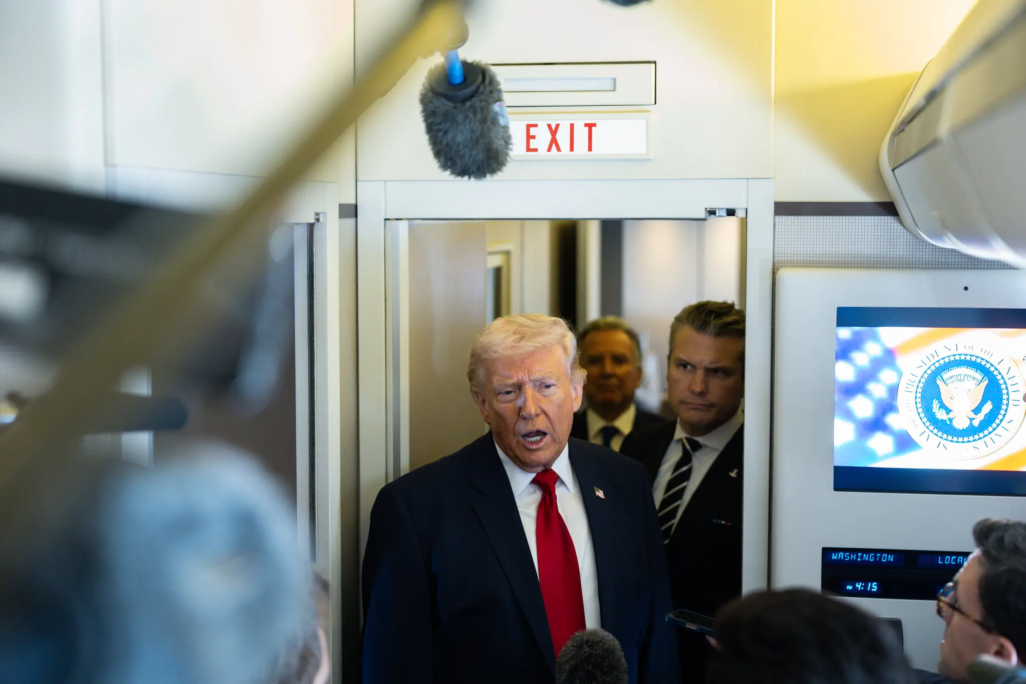 President Donald Trump speaks to members of the media alongside Steve Witkoff, special envoy, and Secretary of Defense Pete Hegseth on board Air Force One last week.